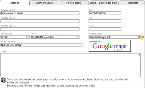 Page 3/8 - L'onglet adresse du module clients (Devis Factures Pro)