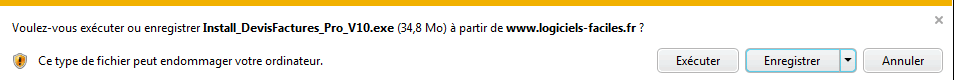 Dans le cas du téléchargement de DevisFacturesV10, vous devez soit Exécuter, soit Enregistrer le fichier, puis l'éxécuter.