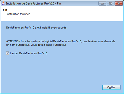 Le logiciel s'est correctement installé (en laissant la case "l'ancer DevisFactures Pro V10" coché, le logiciel démarrera automatiquement: