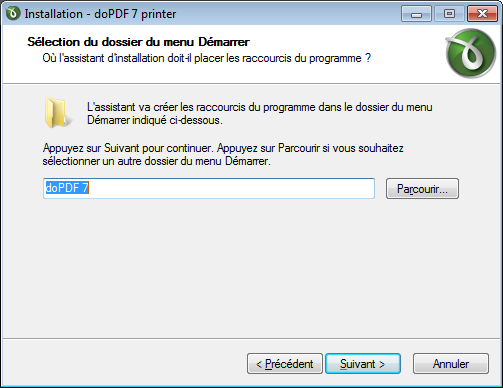 La fenêtre de selection du dossier du menu Démarrer s'affiche :